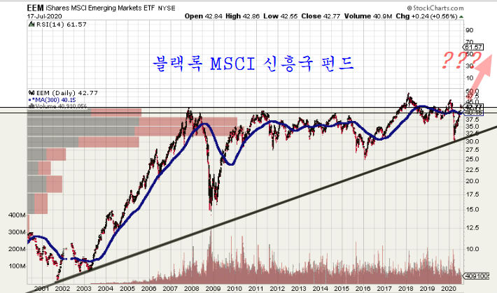 주가의 흐름상 신흥국 지수(펀드)는 13년에 걸친 횡보와 함께 강력한 상승의 힘이 비축되어 폭발 직전의 모습을 하고 있다. 현재 블랙록 MSCI 신흥국 펀드는 2007년 고점을 넘어선 모습으로 상승이 시작되는 경우 지난 10년간 볼 수 없었던 강력한 상승 국면 가능성을 주고 있다.