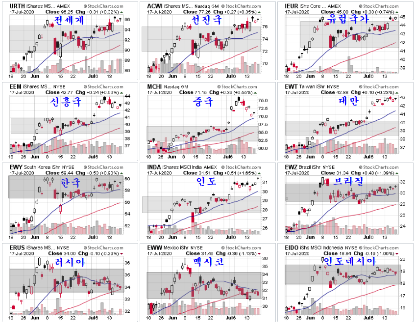 특히 중국이 선도하는 신흥국 중 한국 , 브라질, 러시아, 멕시코, 인도네시아는 동반하여 6월 고점을 넘지 못한 채 박스권 조정 국면이 이어지고 있다. 이미 중국, 대만, 인도가 신고가 상승을 하며 상승 추세를 닦아 놓은 이상 이들 역시 고점을 넘어 상승이 기대된다.