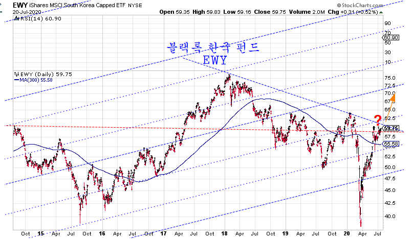 참고로 6000조원 이상의 거대 자금을 운용하는 블랙록 자산운용사의 한국 펀드 ewy는 마지막 저항 돌파를 앞두고 있다. 오늘 주가 상승으로 한국 펀드는 저항이 바짝 다가서게 되며, 이후 머지 않은 시기에 돌파가 예상된다. 이 저항이 돌파되면 글로벌 자본이 한국 주식 편입이 강화되며 이 때문에 외국인 수급 중심으로 강한 상승장이 시작된다.