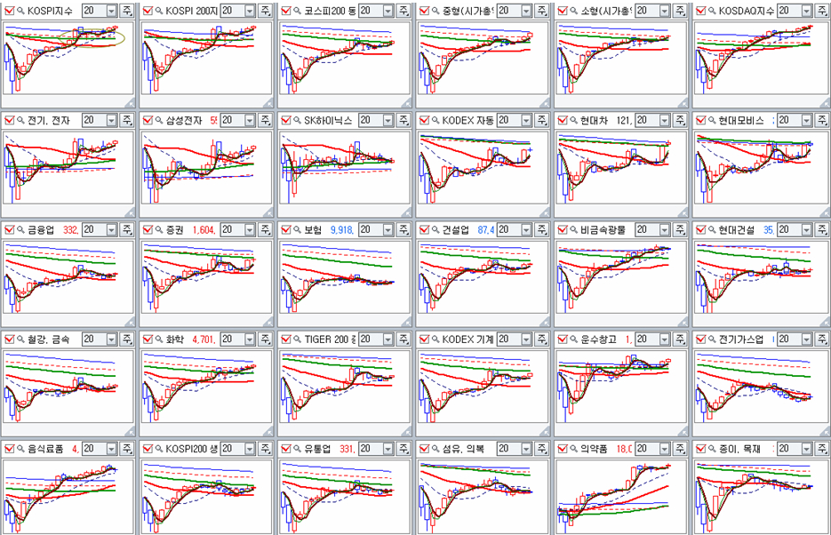 업종별 움직임을 보면, 전기전자 업종이 정배열을 갖춘 덕분에 종합주가지수가 밀집한 이평선을 벗어나 있는 모습이고, 여타 업종은 20주 평균 중기 추세선에서 2개월여의 매집을 거쳐 상승이 시작되고 있다. 주봉을 기준하여 20주 평균을 기준으로 지지가 되면서 N자형 급등을 준비하는 과정이다.
