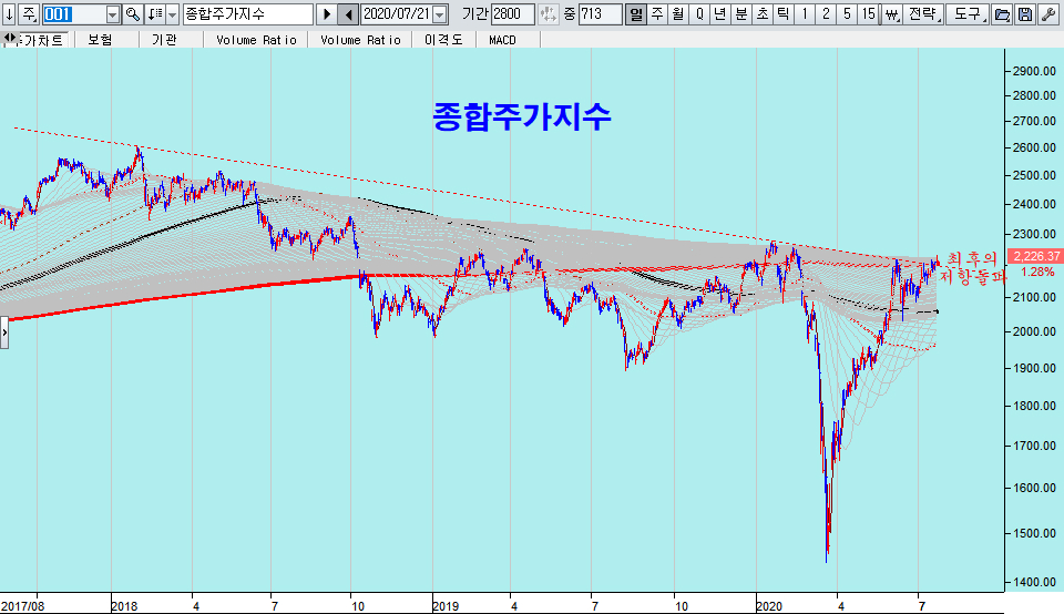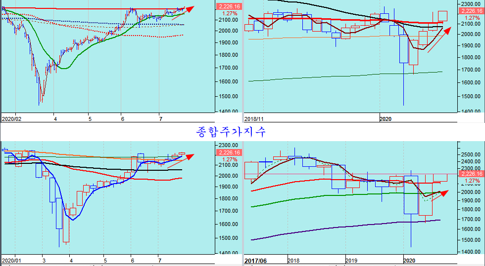 오늘 상승으로 종합주가지수는 기술적 측면에서 밀집된 이동평균선 저항의 밀림을 헤치고 위로 오른 모습이며, 2018년 고점과 2020년 고점을 잇는 저항을 돌파하고 있다.