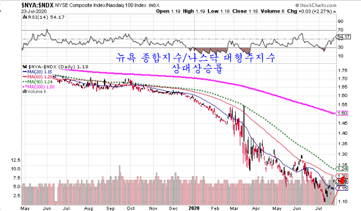 뉴욕종합지수를 나스닥 대형주지수로 나눈 상대 상승률은 2019년 12월 이후 급격히 추락한 모습을 보여주고 있다. 비슷한 모습을 보여야 할 상대 상승률이 이처럼 급격한 변동을 보이는 것은 나스닥 대형주의 과열과 뉴욕종합지수의 저평가를 나타낸다.
