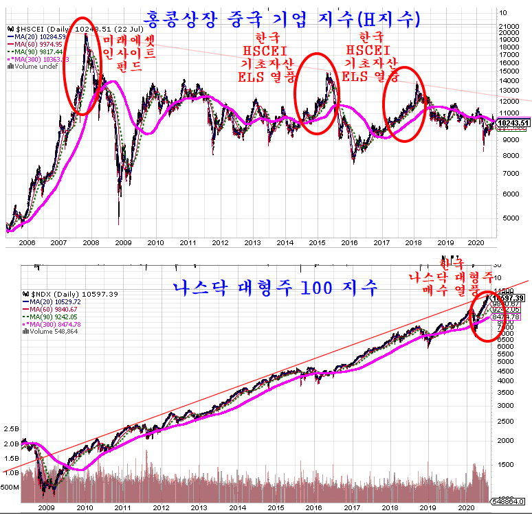 2007년 중국증시 천정은 미래에셋 인사이트 펀드가 만든 작품이고, 2015년 중국증시 고점과 2017년 중국증시 고점은 한국의 홍콩상장 중국주식지수(홍콩 H지수, HSCEI)를 기초자산으로 하는 ELS열풍이 만든 고점이다. 중국 증시에서 세차례 천정을 만든 경험으로 이번에는 미국 나스닥에서 천정을 만드는 모습을 보이고 있다.