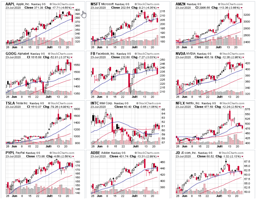 시가총액 1위 기업인 애플(AAPL)이 4.66%가 하락하면서 단기 추세를 이탈한 모습이고, 마이크로소프트 MSFT도 쌍봉과 함께 20일 평균을 이탈하고 있다. 아마존 AMZN, 구글 GOOG, 페이스북 FB, 테슬라 TSLA,엔비디아 NVDA 등 나스닥 시가총액 상위 기업들이 일제히 하락 전환의 모습을 하고 있다.