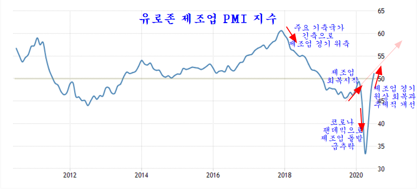 2018년 이후 세계 각국의 긴축정책과 함께 위축이 이어졌던 세계 제조업 경기는 2019년 4분기 이후 회복기조로 돌아섰지만, 2020년 초 코로나가 세계에 확산되는 팬데믹으로 코로나 확산 방지를 위한 록다운이 시행되면서 3월 급격한 추락이 나타났다. 그러나, 점차 록다운을 해제하고 적극적인 경기 부양책을 시행하면서 하반기 제조업의 빠른 회복을 보여준다.