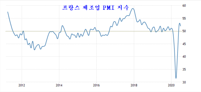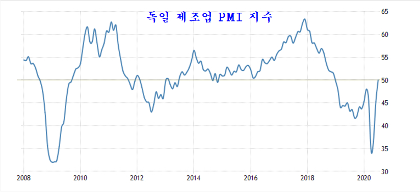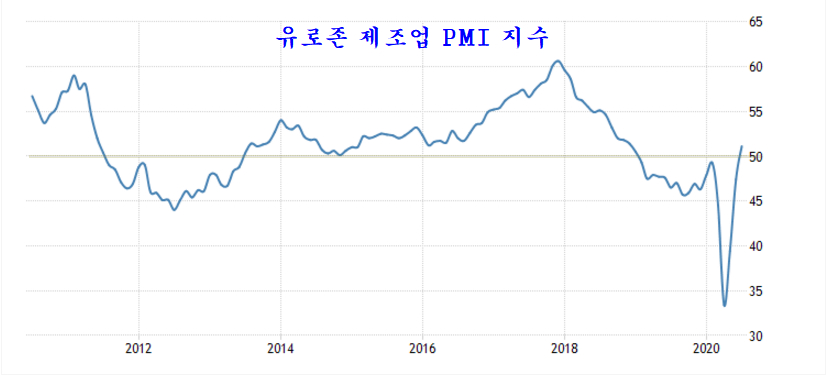 여전히 미국에 코로나 확산이 맹위를 떨치고 있음에도 불구하고 하반기로 들어선 7월 유럽과 미국의 제조업은 코로나의 침체를 극복하고 원상회복 수준으로 빠르게 개선되고 있다.