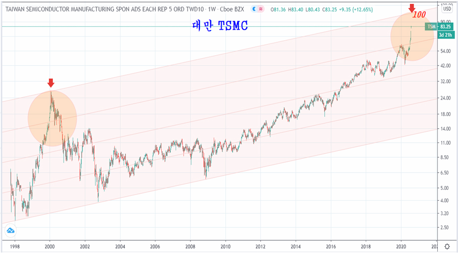 대만 TSMC는 주당 100$이 장기 시세 구도상 천정권이며, 현재의 가격은 제값보다 훨씬 비싼 Overshooting 과정이다. 오를수록 탐욕 대신 밸류에이션에 주목하고 두려움을 가지고 매도할 자리이다.