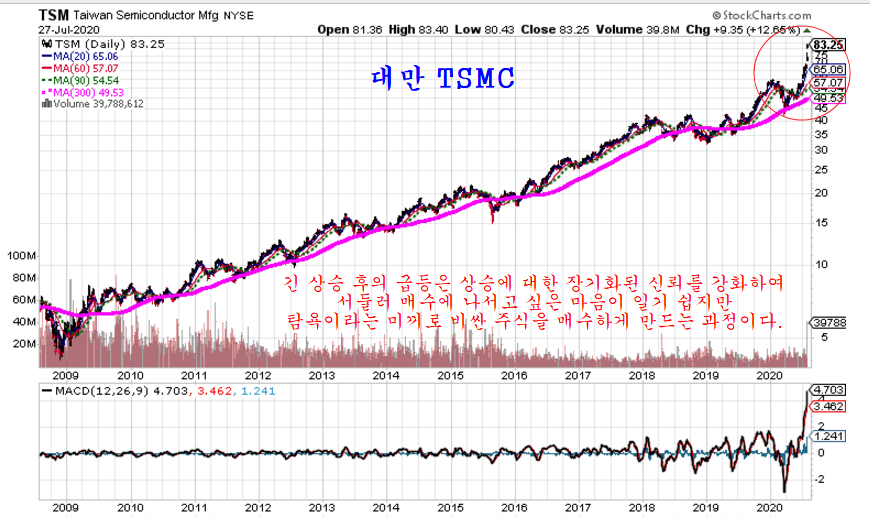 대만 TSM은 이틀 연속 10%가 넘는 급등을 하고 있다. 지난 주말 9%대 상승에 이어 어젯밤 12.65% 상승함으로써 대형주 치고 초 급등 장세이다. 주가가 상승할 때는 실적 호전 등 호재를 동반하기 마련이고, 이처럼 호재를 동반하며 주가가 급등하면 일반은 기업이 새로운 차원의 성장으로 인식하여 매수하기 위해 서두르기 쉽다.