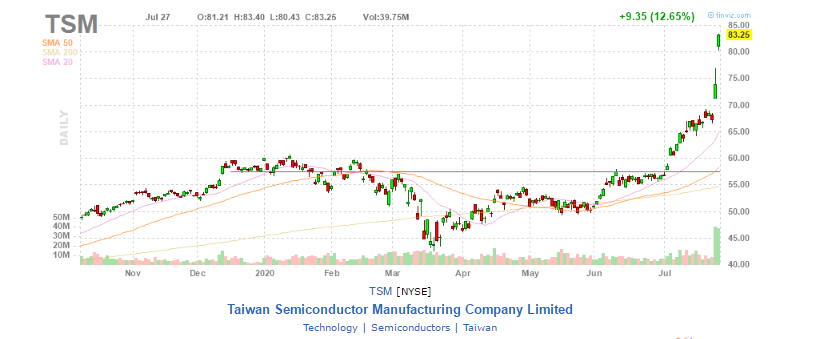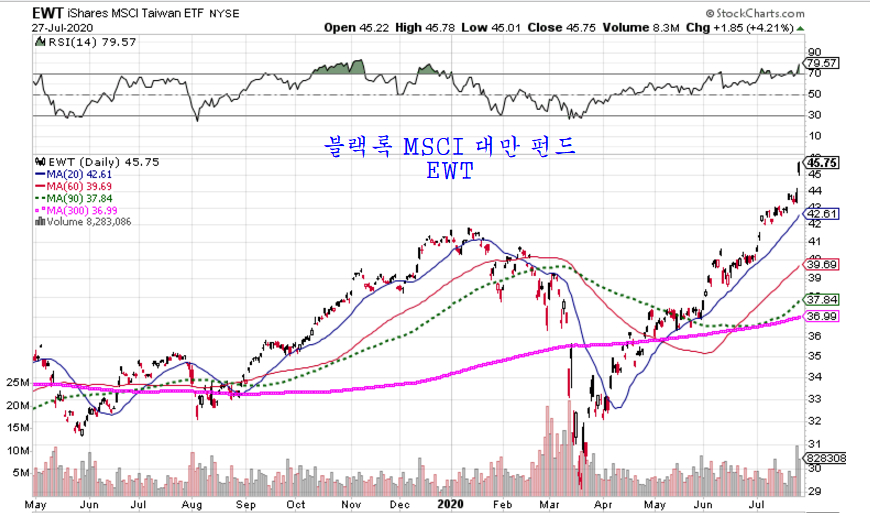6월말 기준 MSCI 신흥국 지수 내에서 시가총액 261억 달러로 삼성전자 209억 달러를 제치고 랭킹 3위의 편입 비중을 나타냈던 대만의 대만반도체(뉴욕시장 : TSM)이 7월 급등하면서 시가총액이 378억$이 되었다. 6월말 기준 시가총액 368억 달러였던 2위의 중국 텐센트와 치열한 2위 경합을 하고 있는 듯 하다.