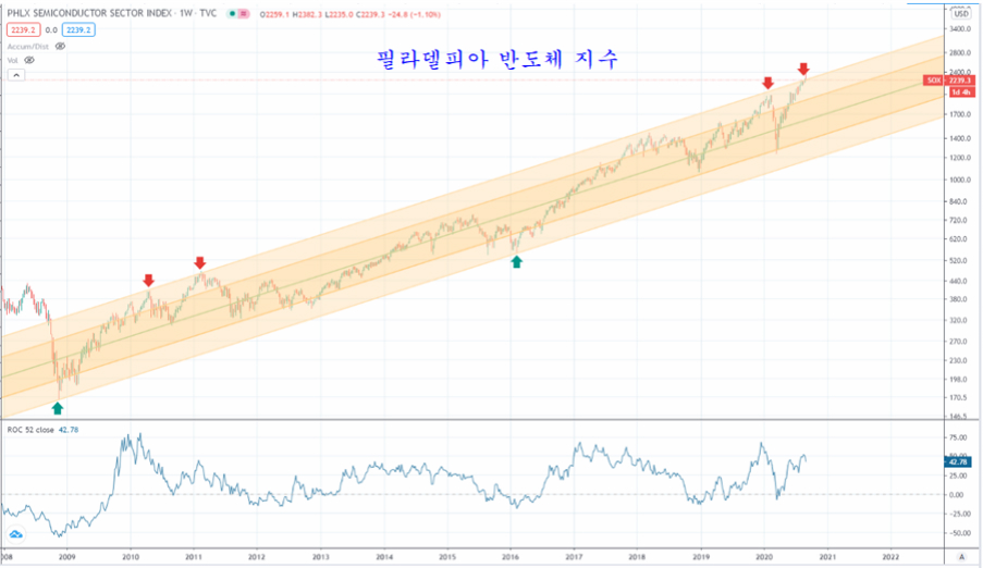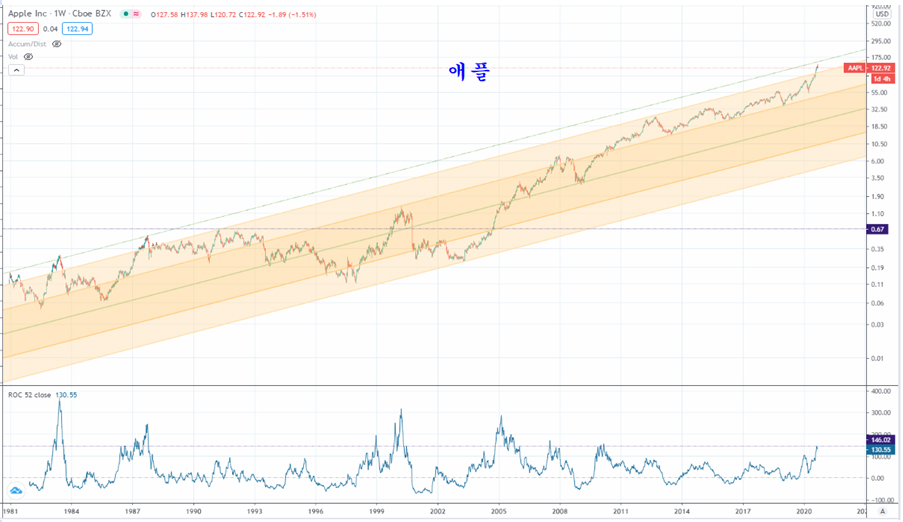 특히 10여 년간 상승을 주도해 온 기술주가 채널 정점에 접함으로써 향후 5년 시장을 주도하는 주도적 위치로 부상하기 쉽다. 이런 변화는 기업의 가치와 밸류에이션에 기준하여 주가를 보면 알기 쉽다.