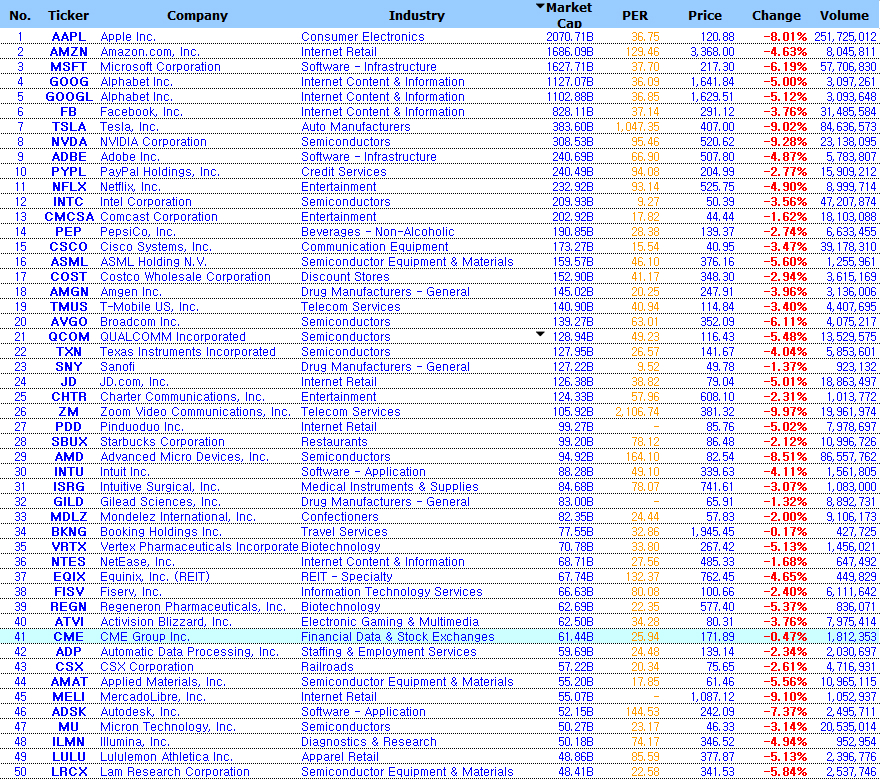 나스닥 시장은 그간 과열 상승으로 하여 주가 수익비율이 대단히 과열된 모습을 보이고 있다. 이것은 조정 국면이 장기화될 수 있음을 의미한다.