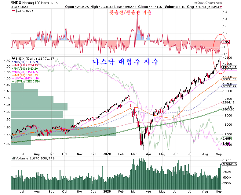 5월 이후 풋옵션/콜옵션 비율이 콜옵션 우위 국면으로 전환되어 과열 상태가 이어져 지금껏 이어진 가운데, 옵션과 관련된 나스닥 대형주를 중심으로 특이한 투기 국면이 이어져 왔다.