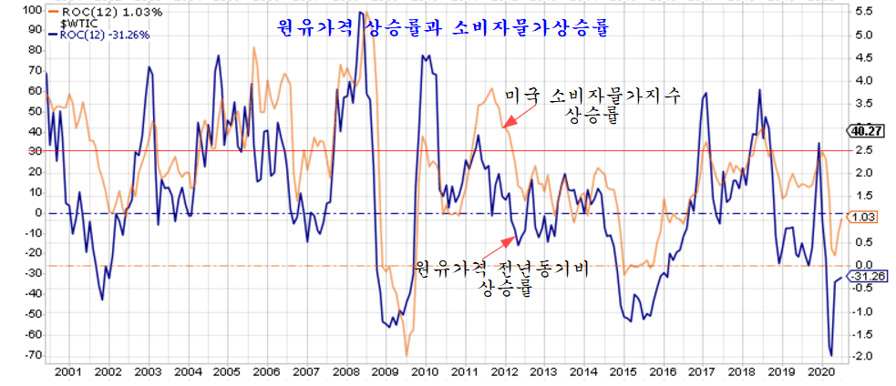 아래의 미국 소비자물가상승률과 원유 가격 전년동기비 상승률을 보면 원유가격 변동이 물가 지수를 결정하고 있음을 알 수 있고, 따라서 물가에 의해 결정되는 미국 국채 가격 및 수익률과 달러 가치 역시 유가에 의해 결정된다고 할 수 있다.