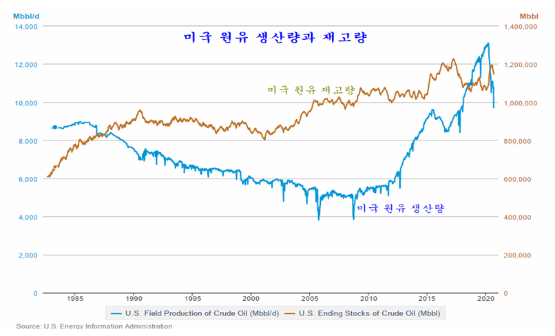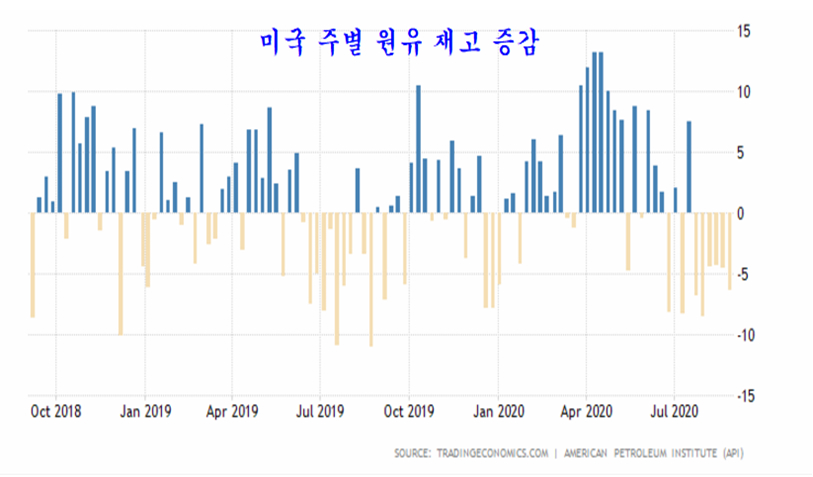 미국은 코로나 확산전 하루 최대 1310만 배럴의 원유를 생산하였으나 코로나 팬데믹 이후 셰일 원유 생산이 줄면서 하루 1170만 배럴 수준으로 원유 생산이 줄어 일일 180만 배럴 정도가 감소한 상태이고, 지난주 태풍으로 인해 원유 생산이 차질을 빚으면서 하루 970만 배럴 수준의 생산을 나타냈다. 그럼에도 불구하고 유가는 오히려 상승 대신 하락하였다.