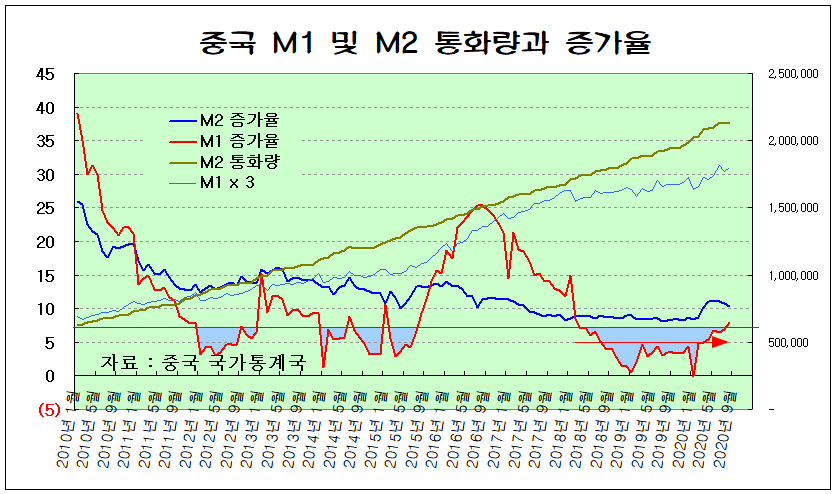 이런 변화는 중국 인민은행의 통화 정책으로부터 나타나고 있으며, 2018년 4월 이후의 강력한 중국의 긴축 정책이 세계 제조업 경기 둔화와 경기 관련산업의 위축 및 주가 하락의 원인이 되었다. 그러나 2020년 8월 현재 중국 인민은행은 긴축을 끝내고 통화를 늘리며 새로운 성장 국면을 시작하고 있다.