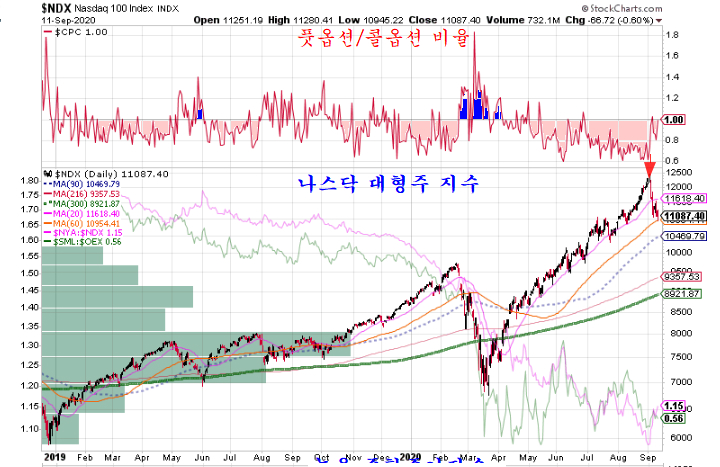 애플 aapl, 마이크로소프트 msft, 아마존 amzn, 구글 goog, 페이스북 fb, 엔비디아 nvda, 테슬라 tsla, 인텔 intc, 페이팔 pypl, 어도브 adbe 등 그간 상승을 주도해왔던 나스닥 대형주들이 9월 들어 하락하며 8월 상승을 반납한 가운데 하락 전환의 모습이 나타나고 있다.
