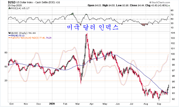 달러 인덱스는 올 들어 5월까지 강세가 이어진 후, 미국의 통화 공급의 증가와 함께 약세로 이어진 후 9월까지 하락했다. 그러나 최근 3일 반등이 40일 평균을 넘어 반등이 이어졌다.