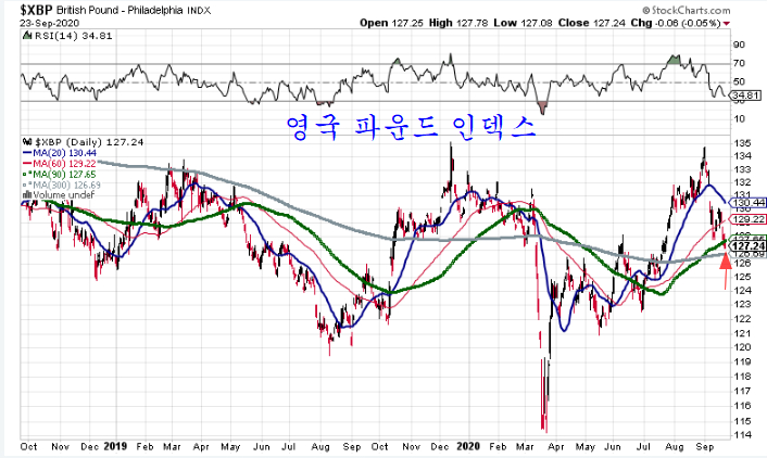 6개국 통화에 대한 무역 가중 평균으로 정해지는 달러 인덱스는 다른 나라 통화에 따라 상대적으로 결정된다. 먼저 영국 파운드화 인덱스는 8월 급등한 후 9월 급격하게 반락하며 달러 하락을 멈추는 역할을 하였지만 지금은 60주 평균 지지권에 진입하여 상승이 예상된다.