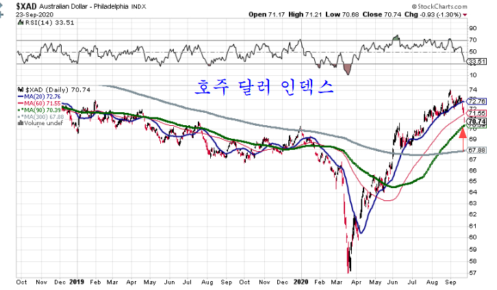 원자재 생산과 수출 비중이 큰 호주의 달러는 경기의 바로미터임과 동시에 외환 시장의 선행 지수의 역할을 한다. 호주 달러는 3월 이후 경기 회복에 앞서 강한 상승을 한 후 최근 3일 하락하여 20주 평균 가격이다.