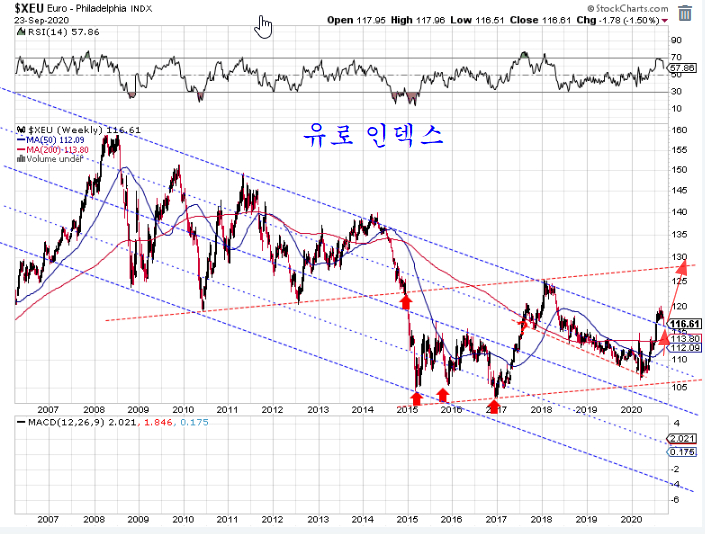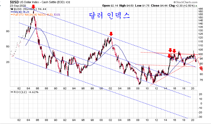 달러의 장기 추세 구도에서 달러는 9년 간 하락의 지지선 역할을 하던 추세선을 하락 이탈한 후 재차 이 저항 선까지 반등함으로써 다시 하락할 가능성이 큰 모습이다. 여기서 달러가 하락이 시작되면 상당 기간 추세를 형성하기 쉽다.