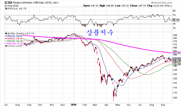 따라서 달러 반등의 저항권 진입과 함께 새로운 달러 하락 추세가 준비되고 있다. 달러 하락 추세는 각국 통화의 달러 환율 하락과 함께, 상품 지수의 상승과 상품과 관련된 섹터의 주가 상승이 동반된다.