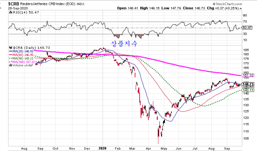 원자재와 상품 가격을 대표하는 CRB 상품지수는 9월 들어 60일 평균을 지지로 쌍바닥 단기 조정의 모습을 보이며 본격 상승을 준비하고 있다. 4분기 시작과 함께 상승하면서 장기 추세선인 60주 평균 돌파를 시도할 듯 하다.