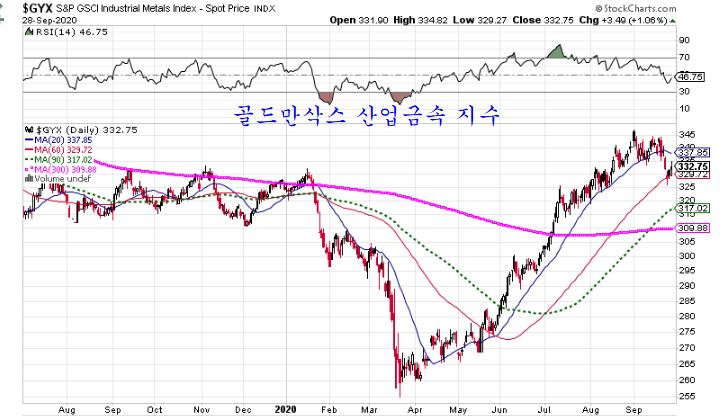 구리 가격이 중심인 골드만삭스 산업금속가격지수는 지난주 조정을 보이며 60일 평균선까지 하락한 후 어젯밤 1.08% 상승 마감하였다. 정배열 상승 추세가 전개되고 있는 만큼 이격 조정을 거쳐 상승이 강화될 수 있다.