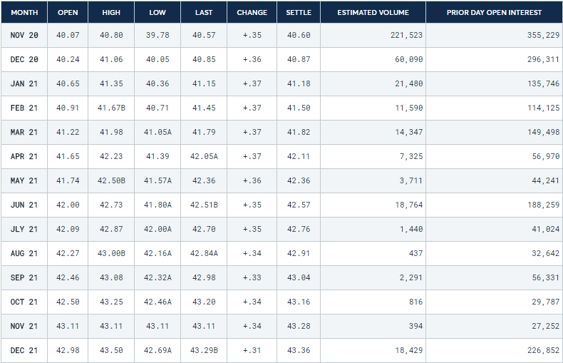 원유 선물 2021년 12월까지 월물별 선물 가격 추이