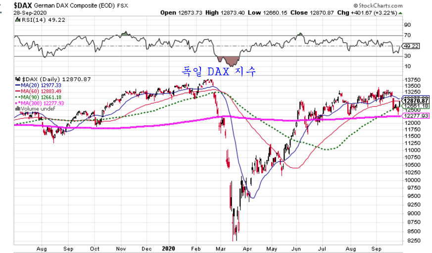 독일 DAX 지수는 지난주 장기 추세선인 300일 평균까지 하락하였으나, 장기 추세선을 지지로 3.22%가 오르며 급등하였다. 장기 추세선 위에서 6월 이후 4개월에 걸쳐 매매 공방이 이뤄지며 매물을 소진하고 매집을 하여 4분기 강한 상승 추세로 발전할 가능성이 있다.