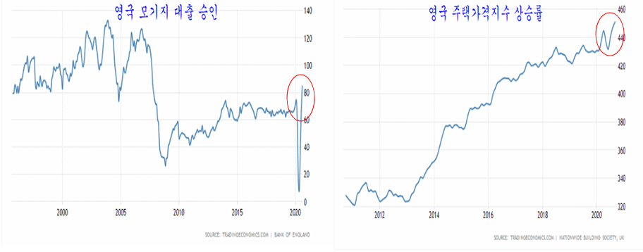 위에 영국의 모기지 대출 승인 건수가 급격히 증가하면서 주택 가격의 상승이 커지는 모습을 볼 수 있다. 코로나 팬데믹 이후 각국의 금리가 낮아지면서 미국을 비롯한 세계 각국이 공통으로 나타나는 현상이다.