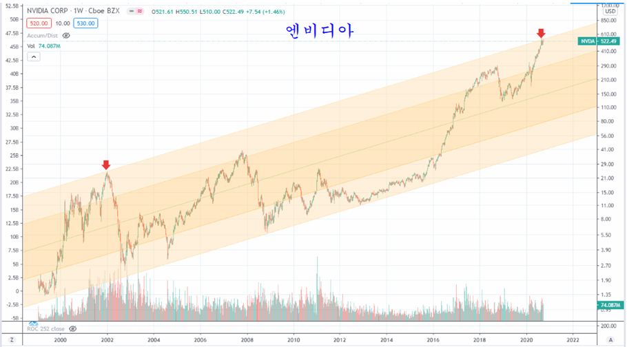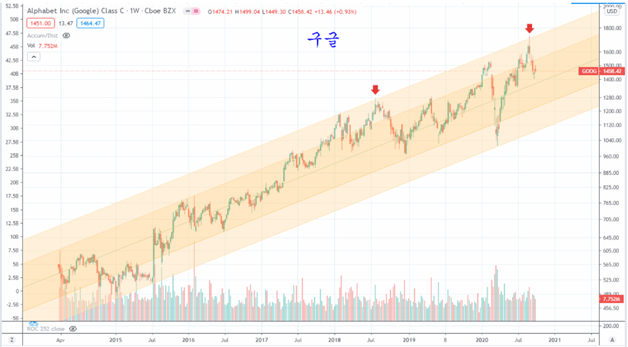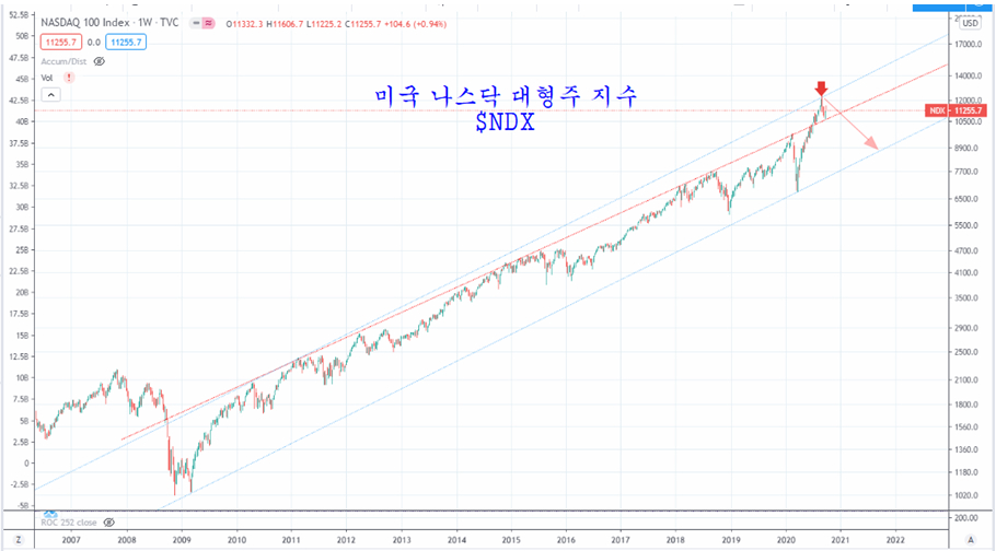 나스닥 대형주는 코로나 팬데믹으로 경기가 위축되고 경기 관련주의 실적이 위축되면서 경기 영향을 덜 받는 비대면 안전 자산으로 간주되며 수급의 쏠림이 나타나 주가가 기업 성장 속도보다 과속 상승해 있는 상태이다. 아울러 10년 이상 이어진 경기주 부진으로 이런 효과가 나타나 장기 상승을 한 끝에 10년 변동 채널의 천정에서 하락이 시작되고 있다.