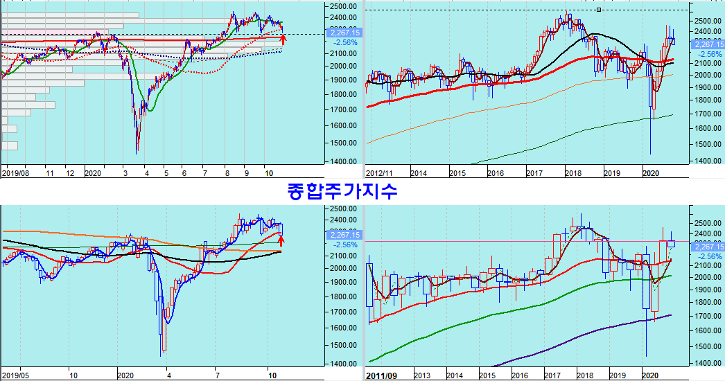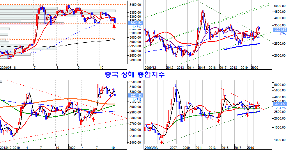 미국 나스닥 시장의 과열 때문에 하락이 이어지고 있으나, 에너지 섹터의 주가가 수십년 대세 채널의 바닥에 머물고, 중국 상해종합지수가 지지권에서 상승을 앞둔 이상 주가는 이들 저평가된 업종을 주도로 하는 새로운 국면의 상승이 준비되어 있다.