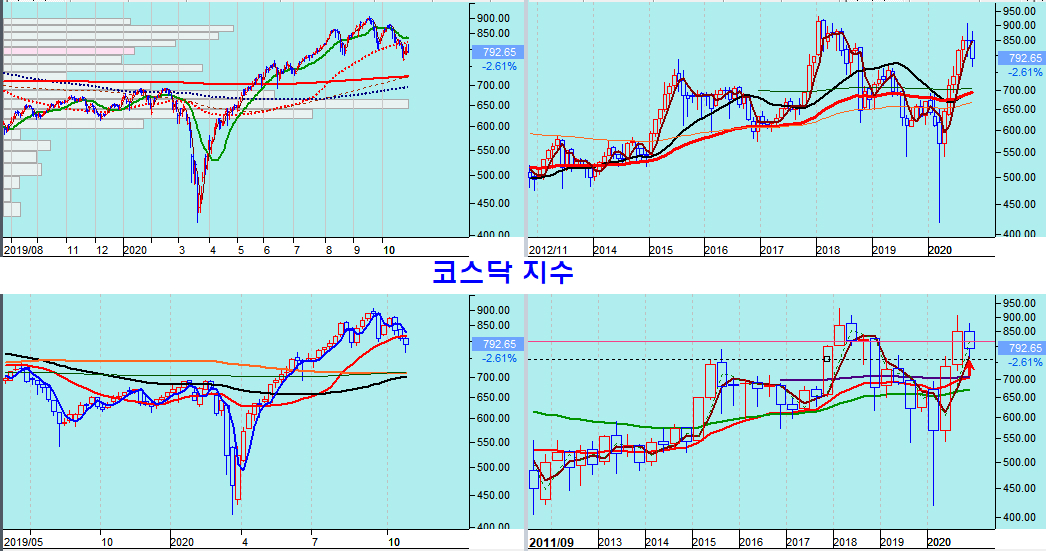 한편, 8월 이후 급락이 이어졌던 코스닥 종합주가지수는 이번 주중 주가가 분기를 기준 시가3선 까지 하락함으로써 2분기 급등에 따른 분기 이격 조정을 마무리하였다. 따라서 기업 저평가된 우량 성장주는 분기 중 가장 싼 가격이기 쉬운 분기봉 시가3선 전후에서 매수할 기회가 된다.