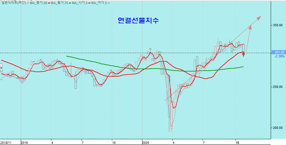 종합주가지수와 연결선물지수는 6월 중기 추세선인 20주 평균을 돌파한 후 재차 20주 평균선에 접함으로써 중요한 눌림목 조정의 매수 기회이다. 상승하는 추세에 대해 주가가 3개월 여에 걸쳐 박스권 조정을 함으로써 추세와의 이격이 발생해 있으며 이것은 하락 정체한 만큼 강한 상승이 준비됨을 의미한다.