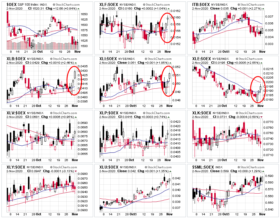 섹터별 상대강도로 보면 산업재, 기초재료, 에너지 등 경기 민감주와 은행주가 대형주 지수에 비해 상대적으로 더 강한 모습이다.