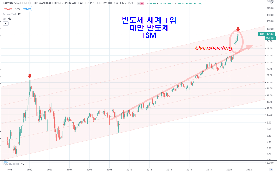 2009년을 저점으로 하여 11년에 걸쳐 이어진 반도체 상승 국면이 2020년 오버슈팅 상승 국면을 거쳐 종점에 이른 듯 하다. 주가는 천정에 이르기 전 평소 사기 어려운 비싼 주식을 매수할 일반을 유혹하는 한편, 매도 단가를 높게 하기 위해 고평가 된 주가가 조정 없이 급등을 하는 오버슈팅(Overshooting) 과정을 거쳐 상승이 마무리된다. 코로나 이후 주가 급등은 이런 오버슈팅 과정을 나타낸다.