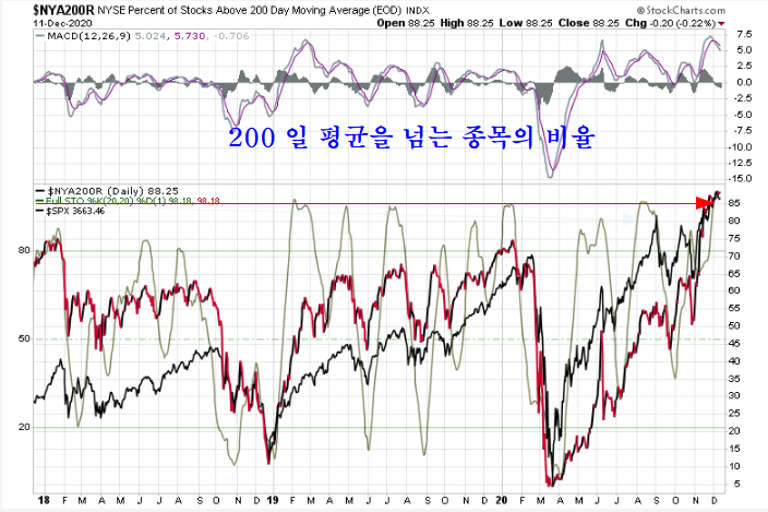 사실 미국 시장은 시장 자체가 상당한 과열 상태이다. 시장 과열을 보는 지표 중에 200일 평균을 넘은 종목의 비율이 있다. 이 비율이 70 이상이면 대체로 시장 과열을 나타내고, 30 이하이면 시장의 과침체를 나타낸다.