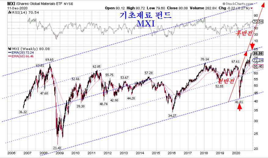 한편, 가파르게 오른 경기 민감주 중에도 과속 상승과 함께 전반전 게임을 마무리하고 조정과 정체 국면으로 진입할 기업이 있는 듯 하다. 경기 민감주를 대표하는 기초재료 펀드 MXI가 대세 상승의 채널의 절반을 이미 거의 채우고 있으며, 채널 상단에 접한 후에는 상당한 조정 기간을 거쳐 후반전을 준비하게 될 것으로 보인다.