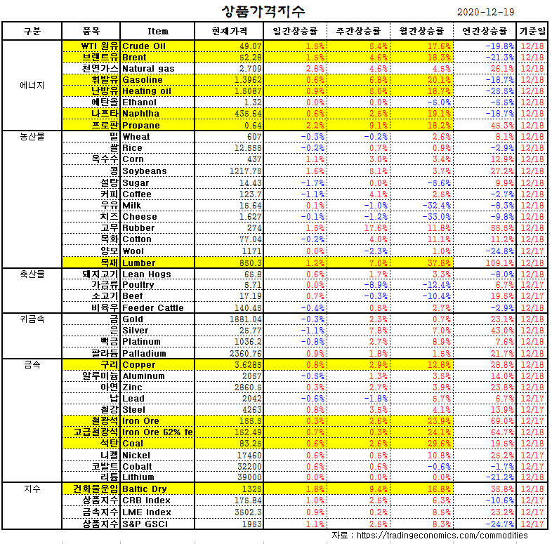 한편, 코로나로 전세계가 역사적인 저금리를 유지하는 가운데, 코로나 백신이 접종이 시작되면서 내년 북반구 온대 지역의 건설 성수기가 강력한 활황으로 시작할 듯 하다.