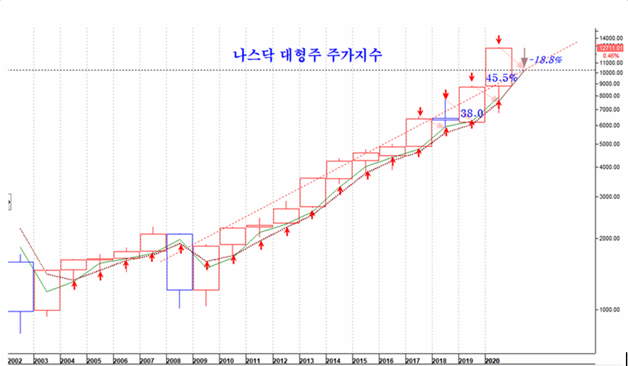 기업의 성장 속도는 더디 움직이지만 주가는 기업 성장보다 과속하므로 주가가 앞서가며 이격 이격 과열을 나타내기 쉬운데, 해가 바뀌면 대개 크게 올랐던 기업은 이격 조정이 나나타기 쉽다. 종합주가지수는 대략 12%, 미국 나스닥 대형주 지수는 대략 19% 정도 이격 조정이 가능한 모습이다.