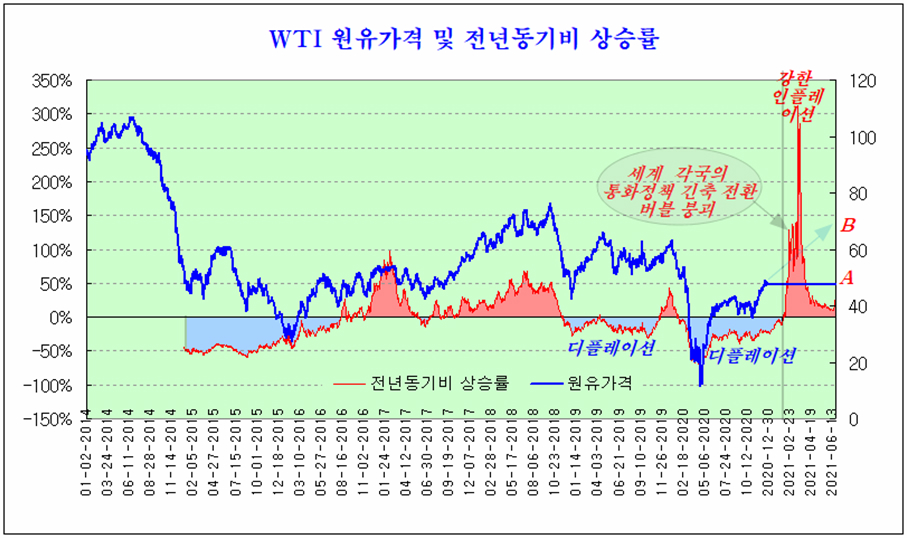 위의 그림은 원유가격이 현재 수준에 고정되어 유지(A)되는 것을 가정할 때, 내년도 분모효과에 따른 원유가격 전년동기비 상승률을 계산해 보여준 것이다. 연말 현재 -21% 하락을 나타내는 원유가격 상승률은 내년 2월말 +100% 수준으로 치솟게 되며, 4월에는 300% 수준으로 급히 오른다. 즉, 2019년 이후 장기간 이어졌던 디플레이션 요인이 급격한 인플레이션으로 바뀌게 된다.