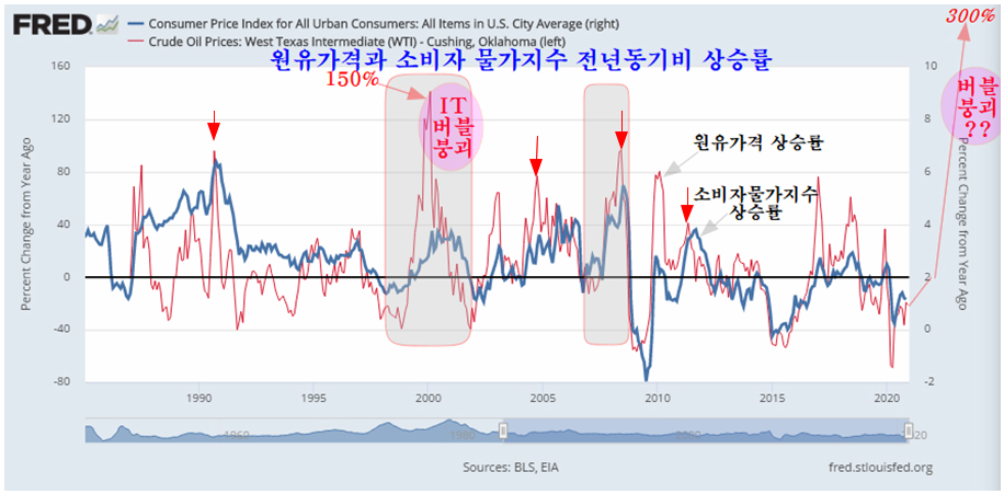 이 당시 원유가격 전년동기비 상승률은 분모효과로 150%가지 올랐고, 소비자 물가지수는 3%를 넘어서면 중앙은행은 긴축 정책을 폈고 이후 IT 버블 붕괴가 이어졌다. 그러나 올 4월 원유가격 전년동기비 상승률이 300%가 넘는다는 점에서 현재의 디플레이션 분위기는 빠르게 하이 인플레이션 분위기로 바뀌게 되며 중앙은행의 통화정책도 팽창에서 긴축으로 바뀔 가능성이 있다. 사실 1990년, 2000년, 2008년, 2012년 원유 가격 전년동기비 상승률 급등에 따른 소비자 물가 불안은 이후 중앙은행의 긴축을 불러 앞서 나타났던 유동성 장세가 소멸되고 유동성이 수축되면서 버블이 붕괴되거나 과열되었던 기업이 빠르게 하락하는 계기가 되었다.