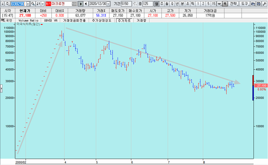 1999년말 Y2K(컴퓨터 연도표기 방법 변경)라는 예기치 않은 컴퓨터 오류를 염려하여 세계 각국의 중앙은행이 1999년 연말을 앞두고 3개월간 통화를 30% 수준으로 늘렸다. 이렇게 늘린 통화는 주식 시장으로 유입되면서 강력한 새로운 천년과 함께 컴퓨터, 인터넷, 통신, 바이오의 발전 성장 기대와 함께 기술주가 가파르게 오르면서 버블을 만들었다. 그 대표적인 기업중 하나가 당시 바이오주로 부각되었던 마크로젠이다.