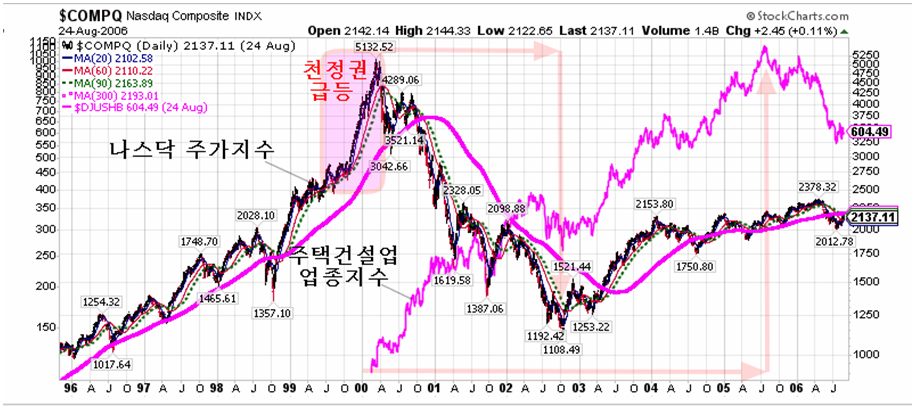 그러나 이처럼 유동성 수축 국면이 되더라도 모든 기업의 주가가 하락하지는 않는다. 당시 유동성을 축소되었지만 주택건설 경기는 매우 강한 회복을 나타내고 있었고, 따라서 주택건설업 주가는 나스닥이 천정을 보였던 5000에서 바닥권인 1108로 하락하는 기간 내내 상승하였고, 이후 미국 부동산 경기 천정권인 2005년까지 주가 상승 추세는 계속되었다.