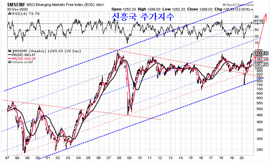 연초 이격 조정을 거치더라도 신흥국 주가지수와 경기주 주가지수는 여전히 장기 추세가 진행 중이며 이 추세는 2024년까지 이어진다. 따라서 꾸준히 수량을 늘려가며 추세를 따라 투자하면 좋다.