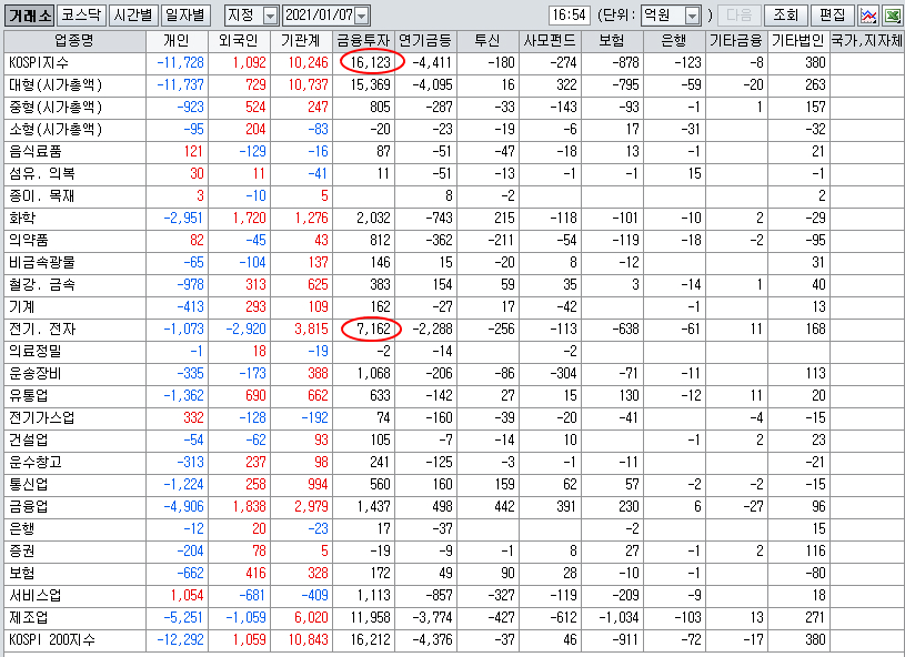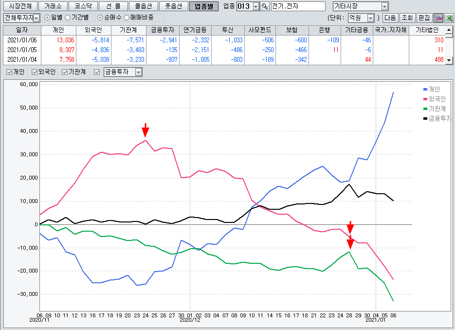 전기 전자 업종은 11월 24일 이후 공격적으로 매물을 쏟아내고 있으며, 실질적으로 2021년 거래인 12월 29일 이후 외국인과 기관 모두 매물이 급증하고 있다. 11월 24일 이후 기관과 외국인이 개인에게 넘긴 전기전자 업종 주식은 8조원 규모에 이른다.
