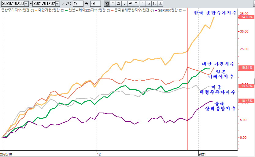 새해 들어 우리나라 주가가 가파르게 오르고 있으나, 다른 나라에 비하면 과열 국면을 나타내고 있으며 다음주 옵션 만기를 앞둔 파생상품과 관련된 투기적 움직임을 반영한다.