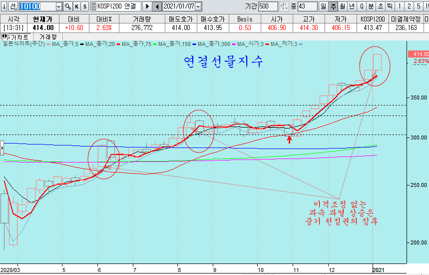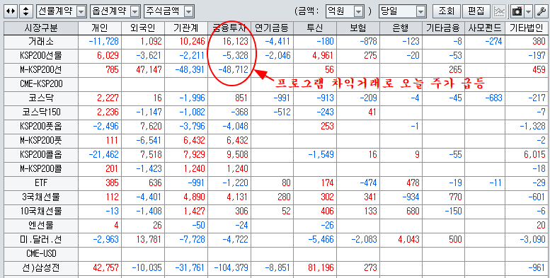 오늘 장중 80포인트가 넘는 급등은 증권사의 프로그램 차익 거래를 이용해 파생 상품 시장에서 이익을 얻기 위한 투기적인 움직임이다. 단지 선물과 현물 가격의 차이에 의해 200개 대형주를 매수하는 프로그램은 매수한 만큼 매물로 나오기 쉬워 상승은 하락을 준비하기 쉽다.