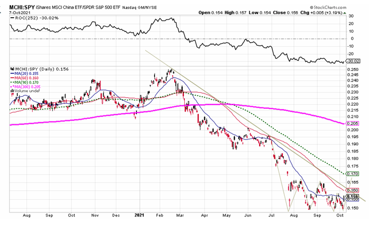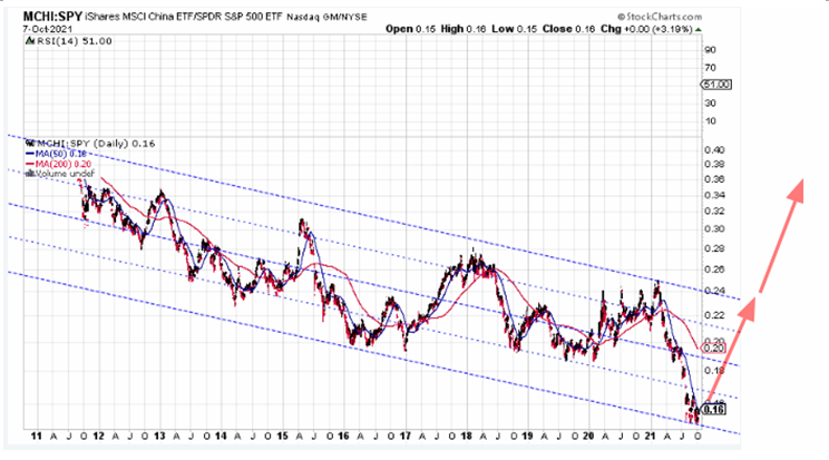 쥬라기: 그간 중국펀드 MCHI를 미국 대형주 펀드 SPY로 나눈 상대비율이