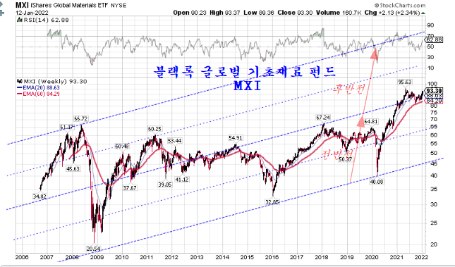 이와 함께 중국, 대만, 한국 , 인도, 브라질, 러시아, 멕시코 등 신흥국의 중요 기업들을 포함하는 블랙록의 MSCI 신흥국 펀드 EEM은 20주 평균을 넘어서며 중기 상승 추세를 스타트하였고, 이와 함께 블랙록 한국 펀드 EWY도 3개월의 박스권 정체 끝에 20주 평균을 가볍게 갭으로 넘어섰다.